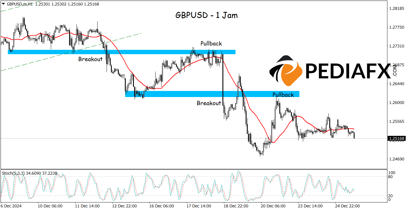 According to the technical overview of the European markets, GBPUSD has experienced a downturn, continuing to face selling pressure after a breakout below the crucial support level. The Moving Average (MA) indicator with a 24-period setting reinforces the bearish signal, as it trends downward. This suggests a dominating selling pressure within the short-term trend.