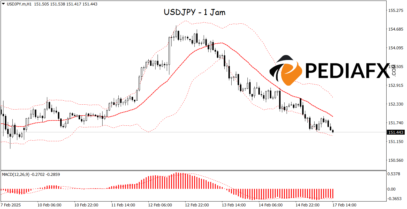 The USDJPY currency pair is exhibiting further signs of weakness as the price approaches the lower boundary of the Bollinger Bands. This pattern suggests a growing selling pressure, particularly when the price breaches a significant support level in this region.