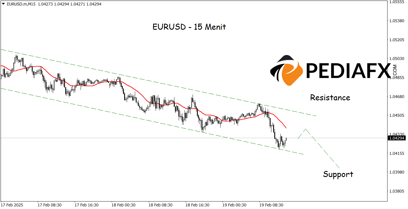 On the 15-minute timeframe, the declining trend of EURUSD becomes increasingly apparent with the formation of lower highs and lower lows that signify a strong bearish trend. The price is currently trading below the 24 MA, which serves as a dynamic resistance, reinforcing the signals for further weakening. Should the selling pressure continue, EURUSD could potentially plunge deeper towards the support level of 1.04000.