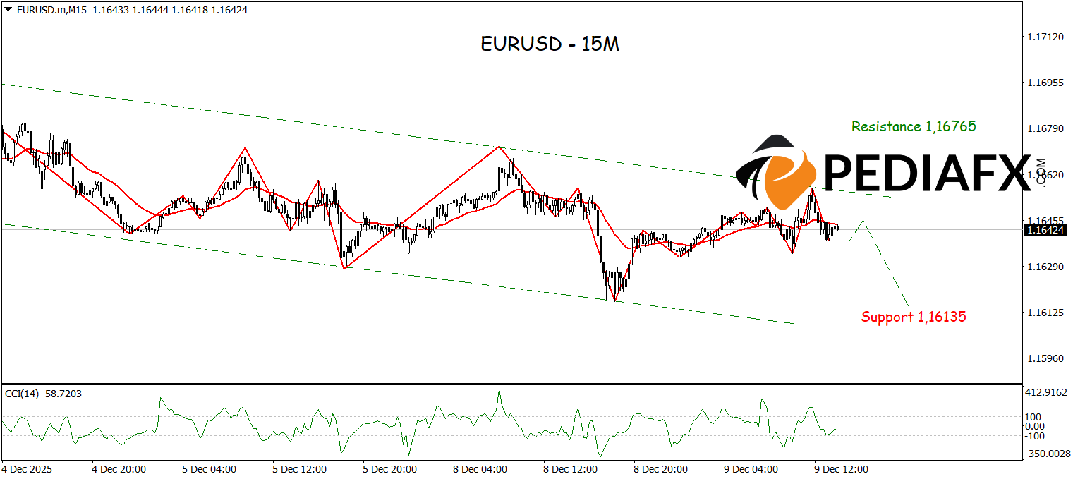 On the 15-minute timeframe, the development of a bearish channel provides additional confirmation that the downward pressure dominates short-term movements. The MA and Zigzag moving downward consistently bolster the bearish technical structure, while the CCI indicator falling from the overbought region signals that the correction momentum remains strong. With a series of aligned technical signals, EURUSD has opportunities to continue its decline and test important support around the 1.16185 level.
