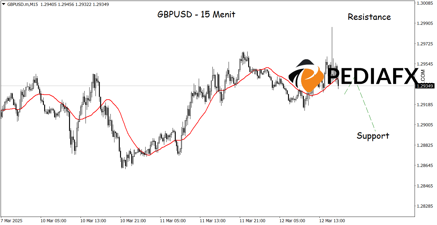 The GBPUSD movement on the 15-minute timeframe indicates the potential for weakening as the 24-period Moving Average (MA) is declining. The drop in this MA reflects an increase in selling pressure in the short term, suggesting that bearish sentiment is currently dominating the market. If selling pressure persists, GBPUSD may test the nearest support area at 1.28930.