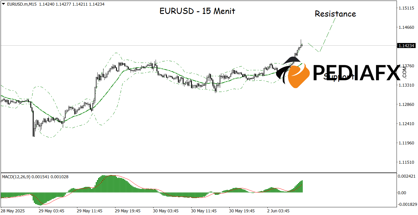 The EURUSD shows potential for continued upward movement after breaking through the upper bands on the 15-minute timeframe, indicating increasing bullish momentum. The technical signals are bolstered by the MACD indicator, which is positioned above both the zero line and the signal line, further supporting the short-term buyer dominance. Stable price movements above the breakout level suggest that buying pressure is likely to continue, testing the level of 1.14875.