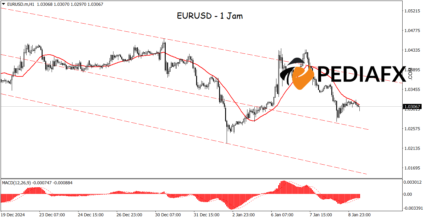 The current movement of EURUSD indicates a continuation of bearish pressure. The formation of a bearish channel on the hourly chart suggests that this currency pair may continue to decline in the near future. The price action within this channel signifies strong selling pressure.