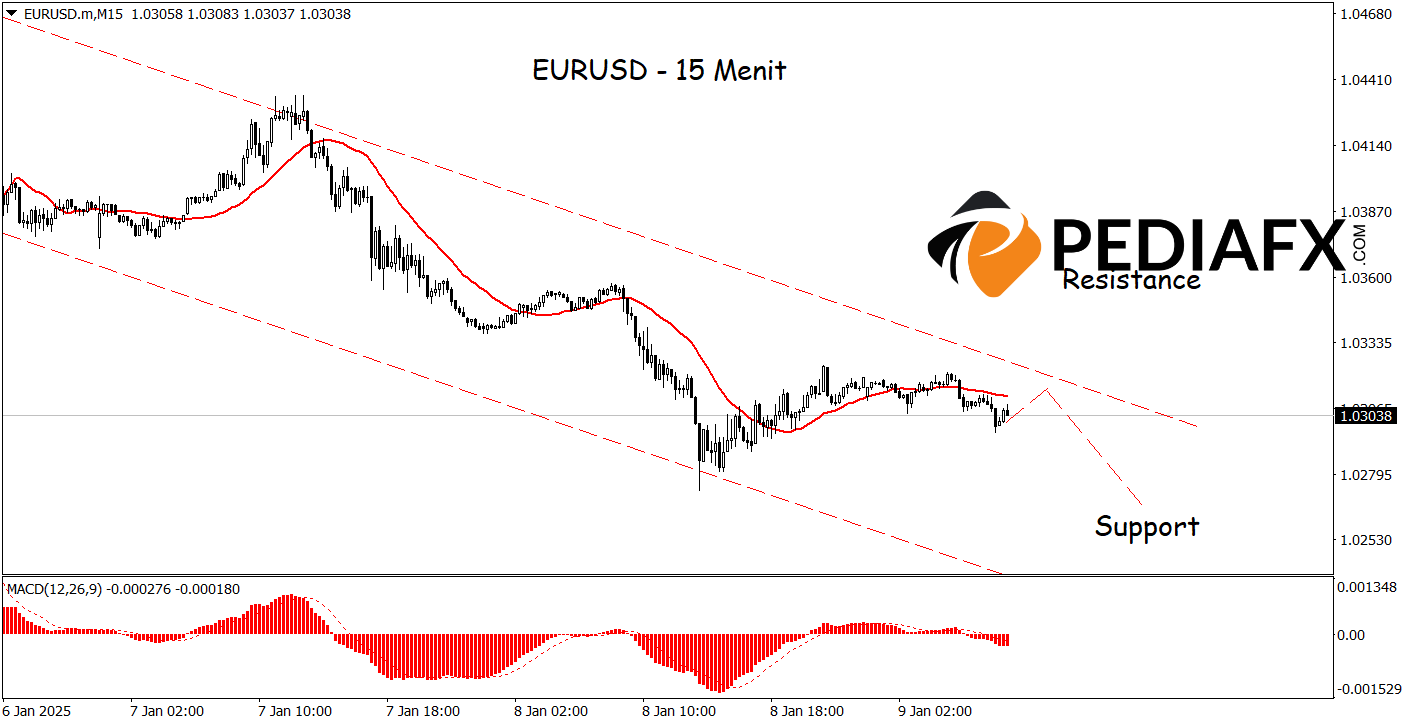 In alignment with the above hourly chart analysis, the 15-minute chart of EURUSD also presents bearish opportunities, as the price is situated within a bearish channel, indicating a continuation of the drop, while MACD is currently in the negative zone, serving as a negative signal. This scenario could push EURUSD down towards the support level of 1.02625.