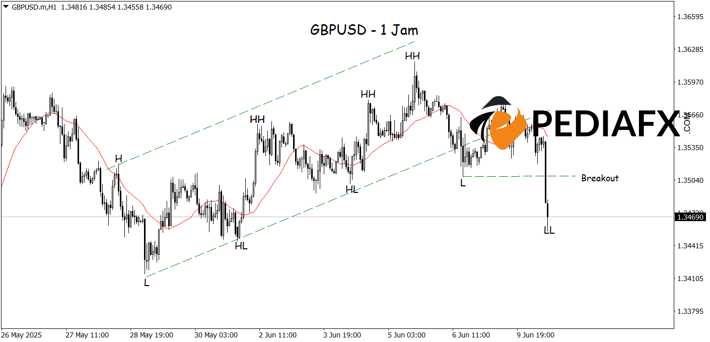 The GBPUSD pair has experienced selling pressure after breaking below the lower boundary of a bullish channel on the 1-hour time frame, which has disrupted the prior uptrend structure. This breaklow is an early indicator of a potential reversal, especially as it was followed by a sharp decline in the Moving Average (MA), which is now acting as a dynamic resistance.