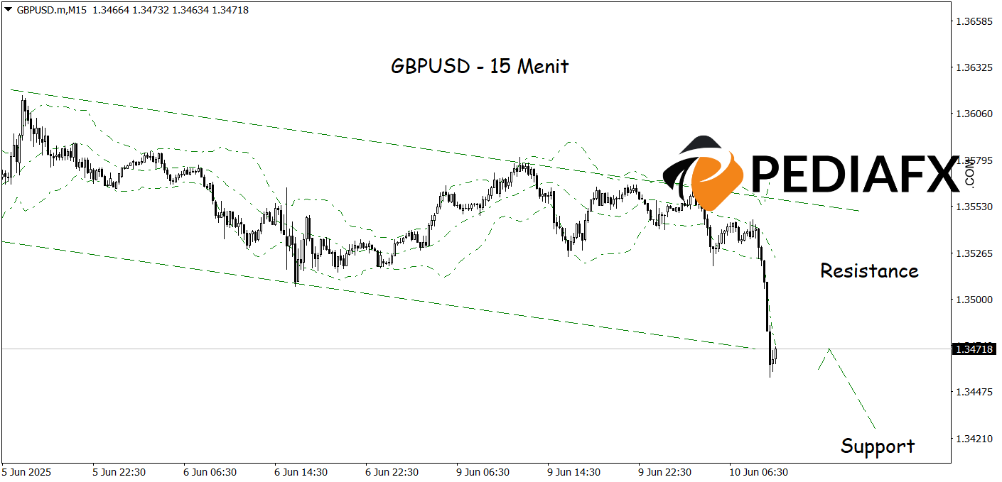 Currently, GBPUSD is moving within a bearish channel on the 15-minute time frame, indicating consistent selling pressure. The price has also breached the lower limit of the Bollinger Bands (BB), suggesting the potential for continued weakness in line with the prevailing short-term downtrend. This breaklow serves as an additional technical signal that bearish momentum is still active, particularly if a significant rebound does not occur soon. As the price remains confined within this channel and fails to breach the dynamic resistance, the possibility of a decline testing 1.34255 remains open.