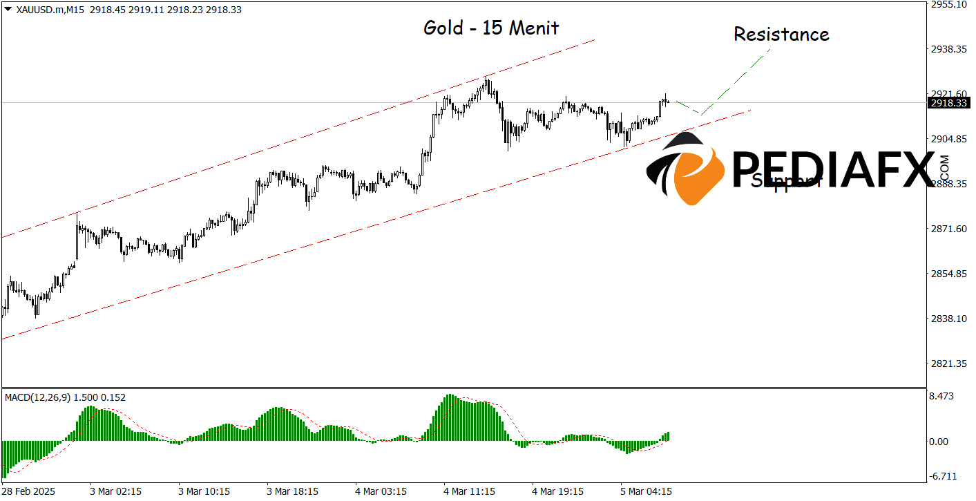 Gold displays potential for increases following the establishment of a bullish channel on the 15-minute timeframe, further confirmed by the MACD indicating positive momentum. The price movement remaining within the ascending channel showcases the strength of buyers, while the MACD positioned above the signal line signifies intensifying buying pressure. Should the price hold above the support channel, gold stands a good chance to continue its ascent towards resistance at $2,938.