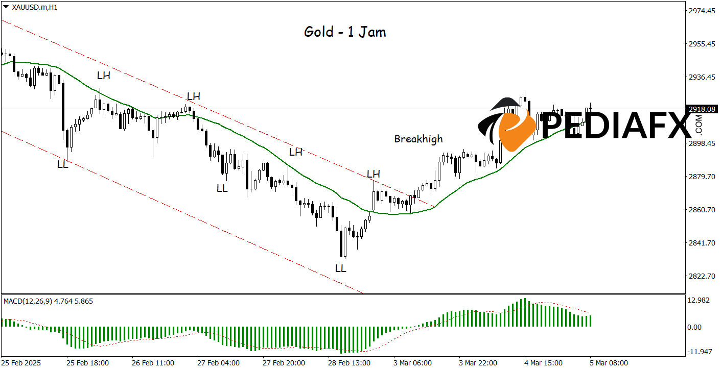 The price of gold has successfully broken through the resistance of the bearish channel, indicating a potential trend shift towards bullish territory. This breakout is supported by the Moving Average (MA), with the price moving above the MA line, showing a strong presence of buyers. Similarly, the MACD has provided a bullish signal through a crossover of the signal line, indicating a strengthening upward momentum. As a result of these factors, buying pressure is increasing, creating a promising opportunity for gold to extend its rally to the next resistance level.