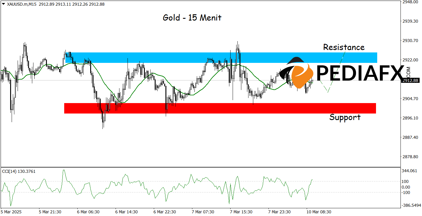 The Commodity Channel Index (CCI) on a 15-minute timeframe is showing a potential rebound from the oversold region, indicating a possibility of a directional reversal for Gold prices. If this momentum continues and the price manages to break through the nearest resistance, there could be increased opportunities for strengthening and testing the resistance level of $2,925.