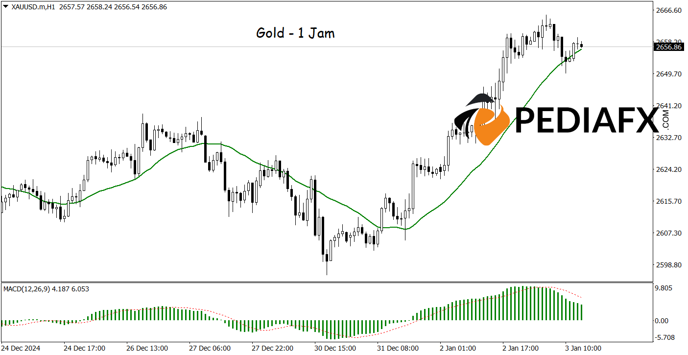 The price of gold appears to have the potential to continue its bullish momentum, backed by confirmations from the Moving Average (MA) and MACD indicators, both indicating possible further increases. The MA suggests that the upward trend remains strong, while the MACD bolsters this outlook with a positive histogram and the MACD line positioned above the signal line.