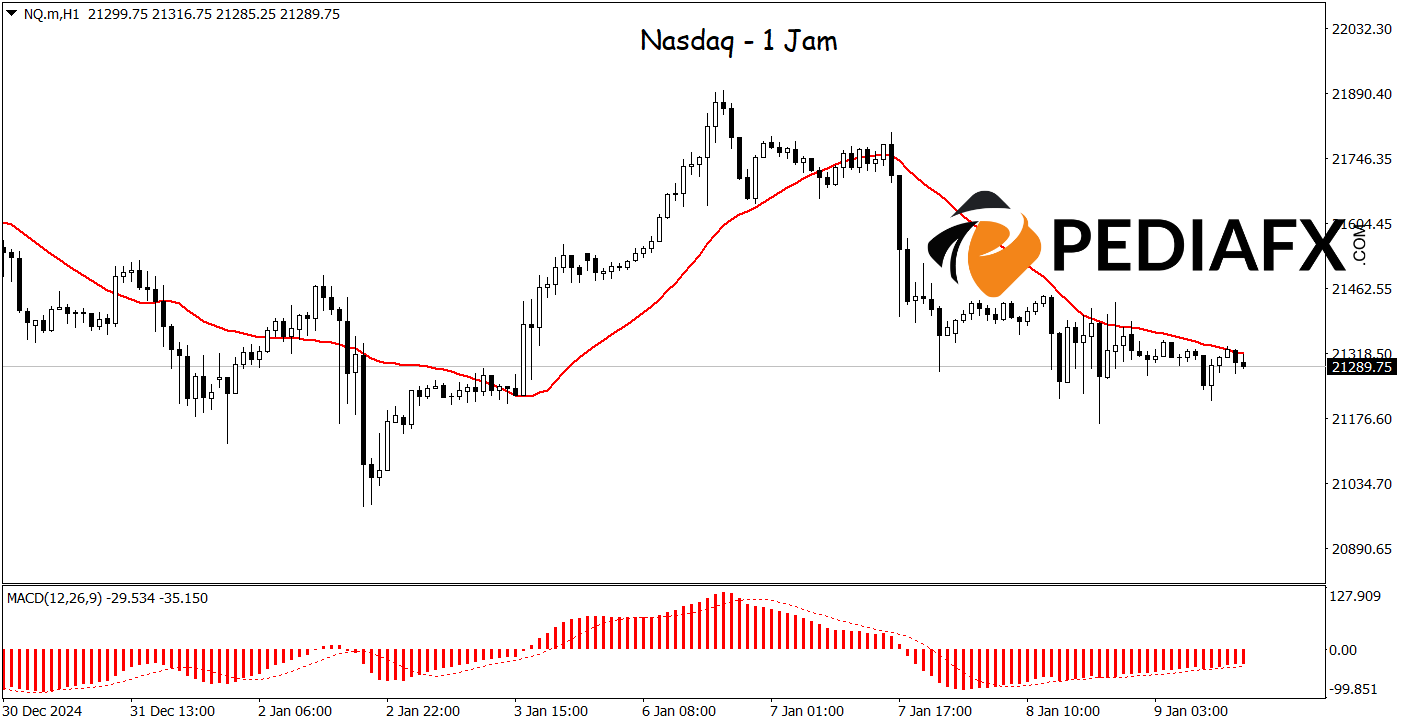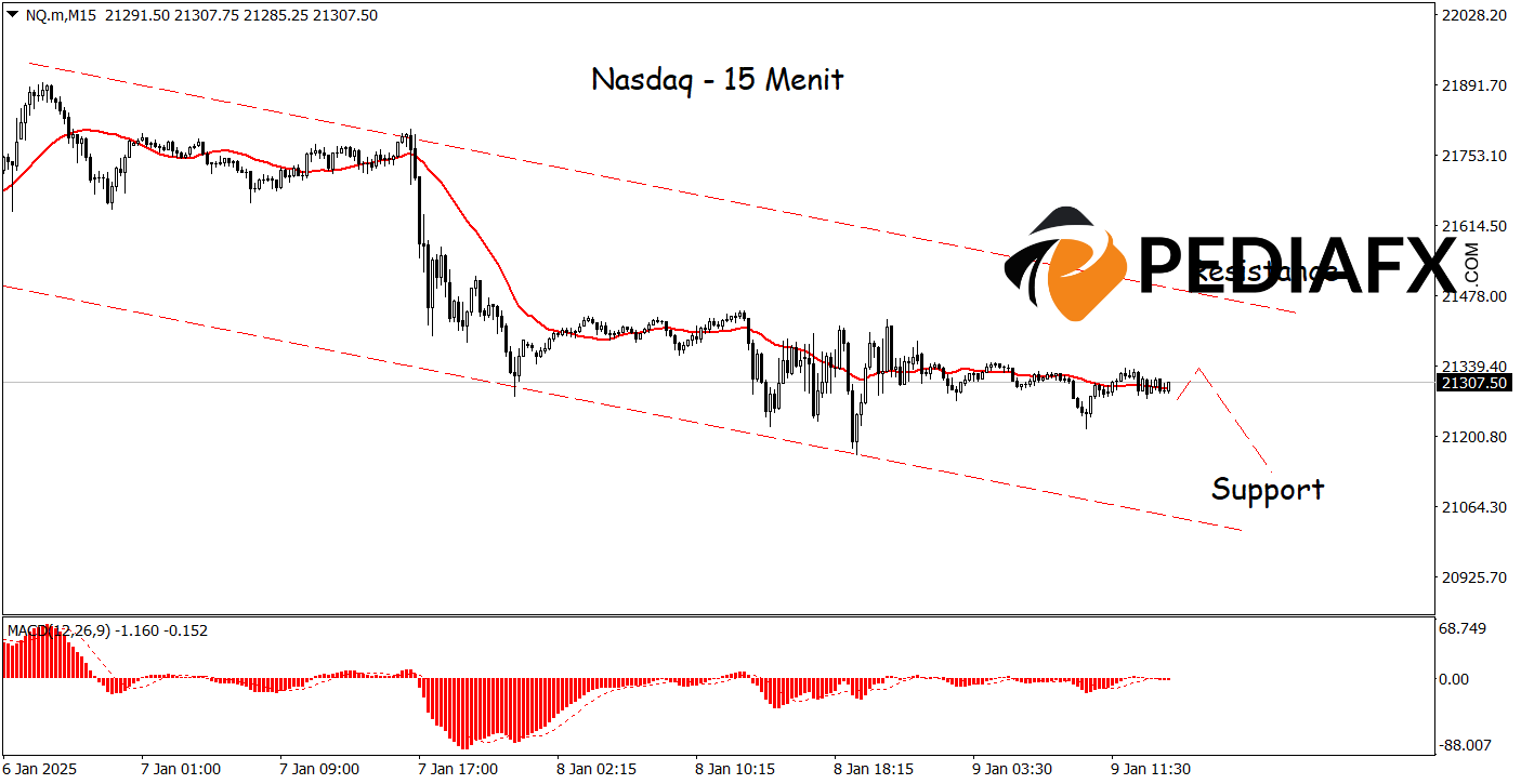 Correspondingly, the one-hour chart analysis aligns with this outlook. The 15-minute chart also presents a downward opportunity as prices currently sit within a bearish channel while the MA indicator continues to trend downward, increasing bearish pressure. If the scenario unfolds as expected, NASDAQ might test the support level at 21,125.