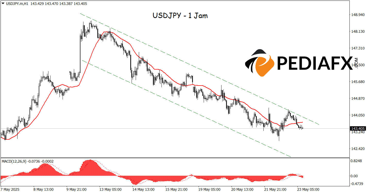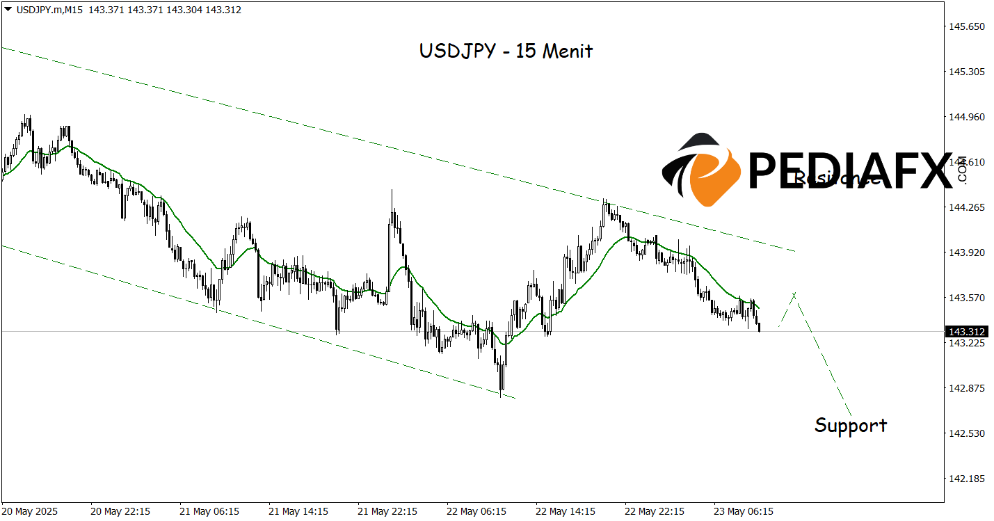The USDJPY is navigating within a bearish channel on the 15-minute timeframe, characterized by a sharply declining Moving Average (MA), signaling strong downward momentum. The downward trajectory of the MA emphasizes that selling pressure is becoming increasingly dominant, creating the potential for USDJPY to continue its descent towards the support level of 142.675.