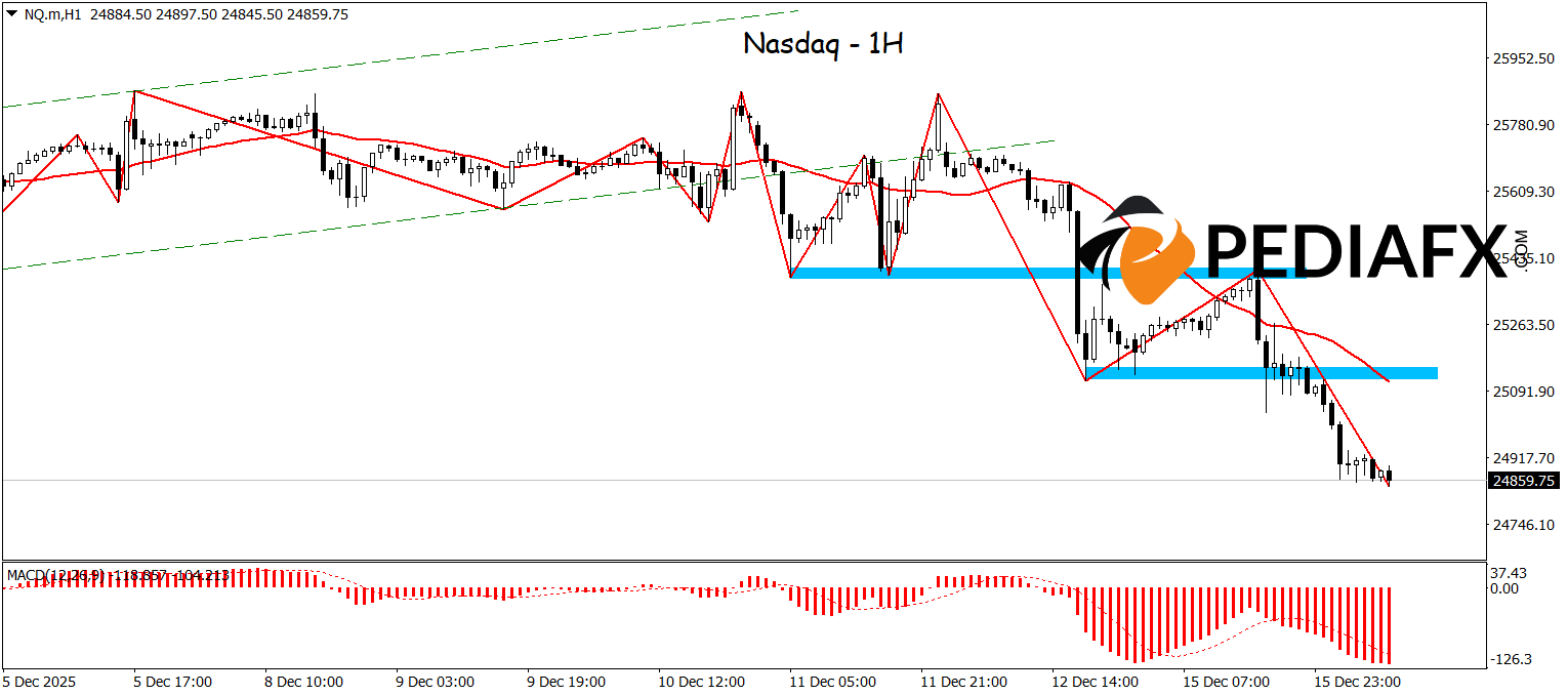 From a technical perspective, bearish signals gain additional confirmation. The ZigZag indicator reveals a clear downward structure following the break low, while the Moving Average (MA) is starting to trend downwards, acting as dynamics resistance. Simultaneously, the MACD is in the negative zone with a widening histogram distance, reflecting strengthening selling momentum. This combination of price structure and indicators supports the potential for the Nasdaq to continue its decline in the short term as long as prices remain below the nearest resistance.