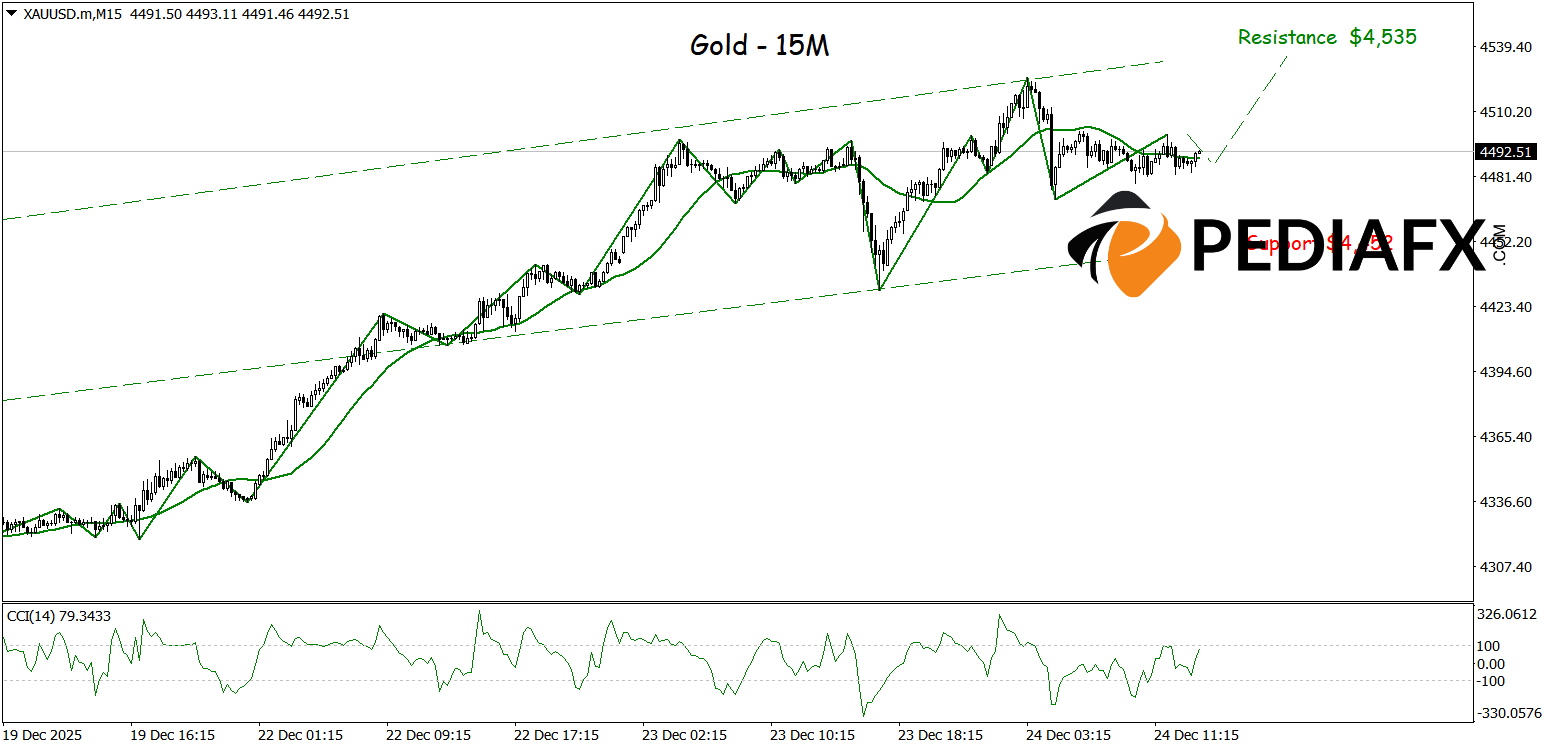 Pada dalam sehari front, the 15-minute chart shows that Gold continues to progress within a saluran bullish, reflecting consistent buying sentiment in the short term. The upward direction of the Moving Average, along with the higher high–higher low structure in the ZigZag, supports the likelihood of further gains, thereby creating room for Gold to test the perlawanan level of $4,535 in the near future.
