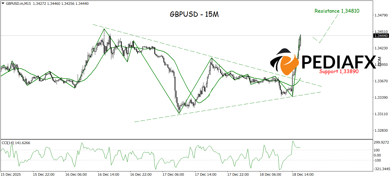 On the 15-minute chart, GBPUSD also displays signs of strengthening after successfully breaking above the upper boundary of a segitiga simetris, indicating a potential continuation of the upward trend. Technical support is highlighted by the rising Moving Average and the ZigZag indicator, which is again forming an tren naik, confirming the momentum of buying activity. With this confirmation in place, GBPUSD is poised for further increases, possibly testing the perlawanan level at 1.34810 soon.