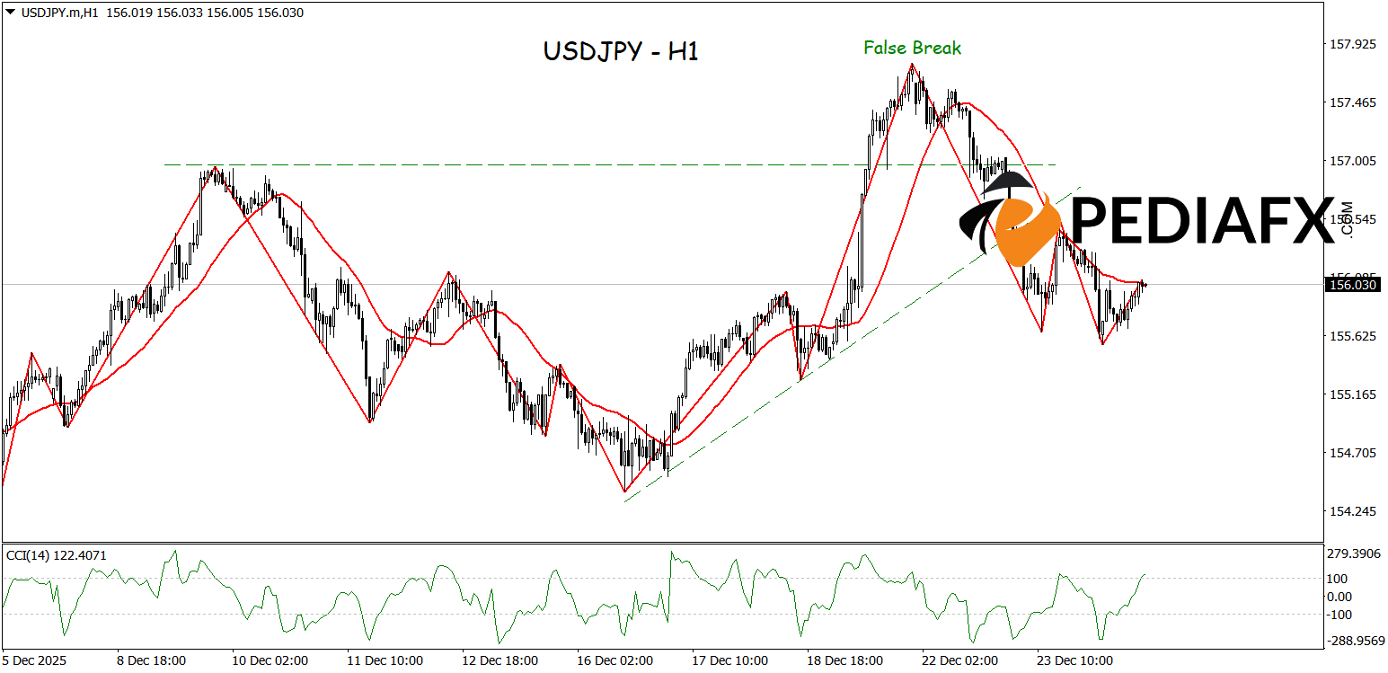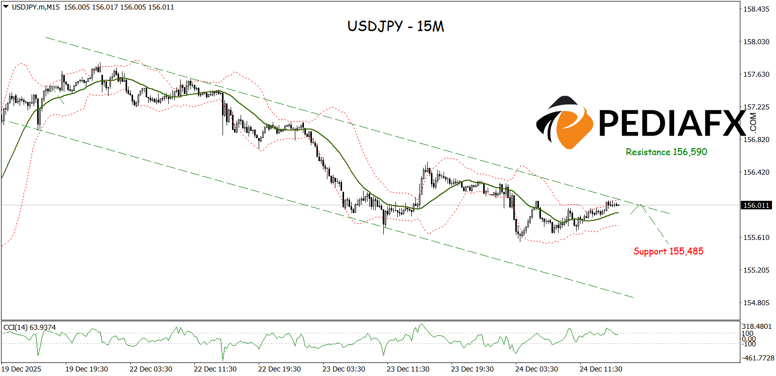 On the 15-minute chart, USDJPY is moving within a 弱気チャネル, reflecting the dominance of selling pressure in the short term. The price rejection from the Bollinger Bands’ 抵抗 area indicates that buying interest remains limited, while sellers continue to dominate the price movement. As long as the price remains below this 抵抗 area, USDJPY has the potential to continue its decline to test the サポート level around 155.485.