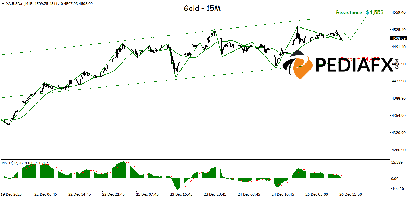 On the 15-minute chart, Gold retains the opportunity to continue its ascent with ongoing bullish technical support. The upward-moving Moving Average indicates that the short-term trend remains positive, bolstered by the ZigZag maintaining a รั้น formation and the MACD in the positive area echoing the sustained buying momentum. Under these conditions, Gold is currently testing ความต้านทาน at the $4,553 level, and as long as prices stay above the การสนับสนุนระหว่างวัน, further strengthening opportunities remain plausible.