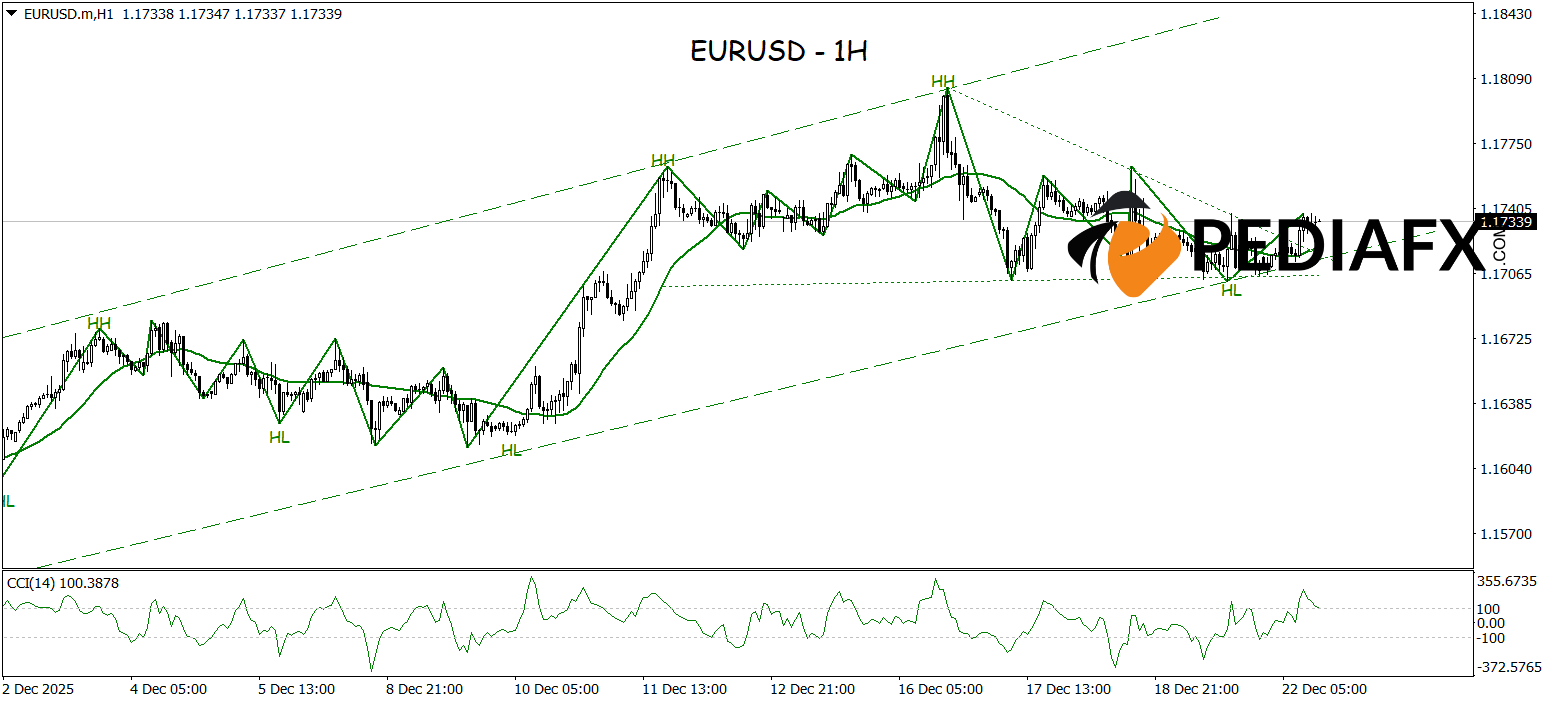 Examining the one-hour chart, the EURUSD pair is maintaining a robust 上升趋势 structure, which indicates that the potential for an upward rally is still very much alive. Currently, price movements are within a 巩固阶段, forming a continuation pattern known as a 下降三角形, with the upper boundary of this pattern convincingly breached. This scenario reflects the market’s efforts to sustain the upward trend, thus paving the way for additional movements accompanied by increased volatility.
