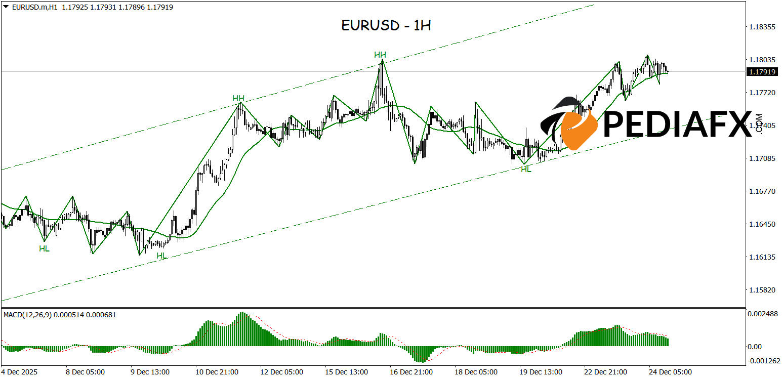 欧元/美元的走势 1小时时间范围 continues to exhibit a solid upward trend, with prices neatly confined within a 看涨通道. This condition indicates that market sentiment is predominantly influenced by the 买家, while selling pressure has yet to break the rising structure. As long as prices remain above the dynamic 支持 zone, the trajectory of EURUSD is likely to stay upward with limited corrective potential.